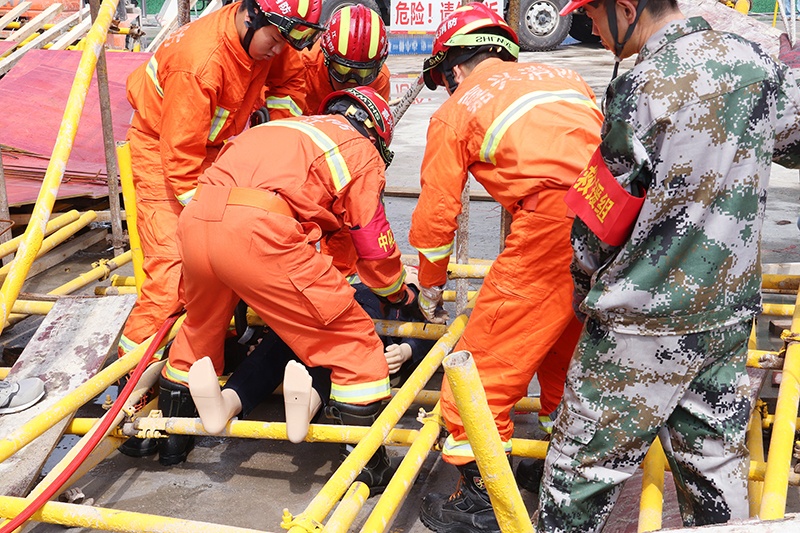 此次演練模擬了“二層樓面混凝土澆筑發(fā)生支模架局部坍塌時兩名工人隨支模架坍塌而墜落”的現(xiàn)場,考察了各組在緊急情況下的協(xié)調(diào)處置和應(yīng)急救援能力?,F(xiàn)場后勤保衛(wèi)組、搶險救援組、醫(yī)療救護組、事故調(diào)查組、對外聯(lián)絡(luò)組協(xié)同作戰(zhàn),快速反應(yīng),圓滿完成了應(yīng)急救援工作。