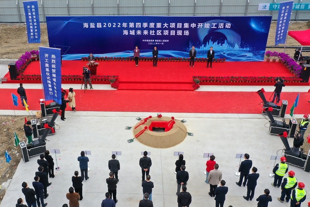 2022年11月15日,海鹽縣第四季度重大項目集中開竣工儀式在海鹽經(jīng)濟(jì)開發(fā)區(qū)盛大舉行,縣領(lǐng)導(dǎo)王碎社、顧秋莉、黃江鶯、陸忠祥等參加。此次開工儀式的舉行也意味著中達(dá)建設(shè)承建的海城未來社區(qū)核心版塊之一——人才公寓及睦鄰中心項目正式破土動工。